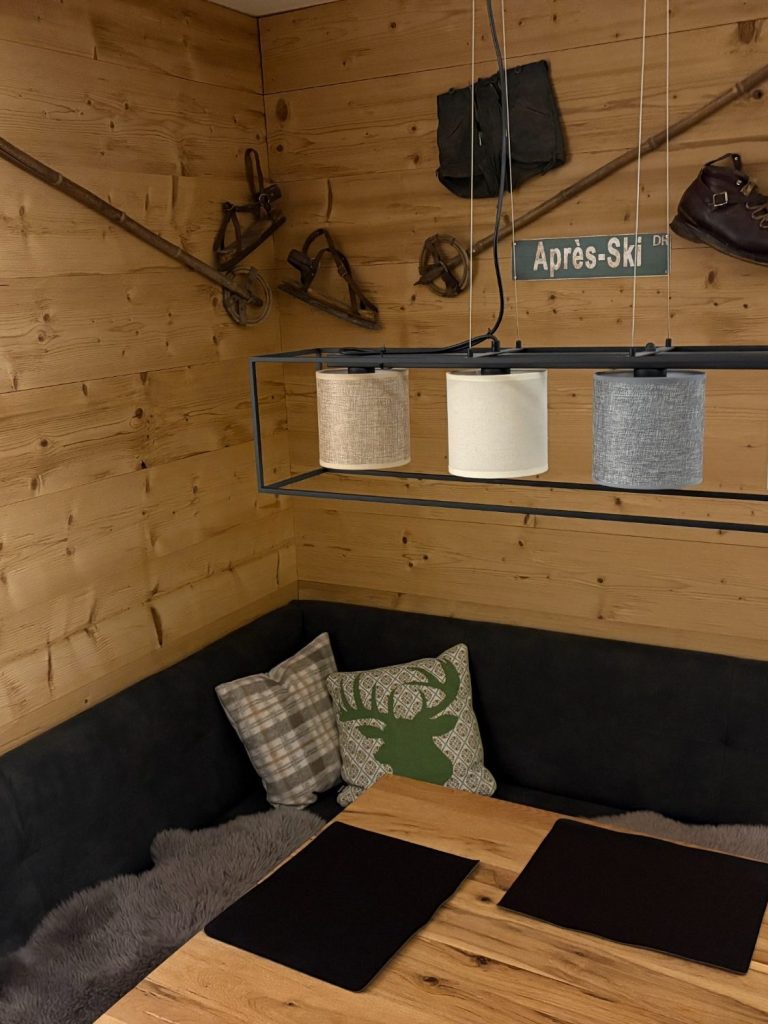 ... und der rustikalen Holzvertäfelung aus gehackter Fichte erinnert an eine Auszeit auf der Berghütte. Hier könnt ihr in gemütlicher Runde Essen, Trinken, Spielen oder einfach nur Spaß haben. Genießt die Atmosphäre und entspannt euch in der gemütlichen Wohnung.